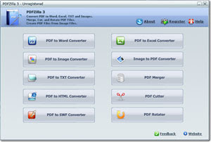 PDFZilla is an easy-to use desktop application which can convert PDF files to various editable document and web formats including MS Word Documents (DOC) , Rich Text Document (RTF) , Plain Text File (TXT), Images (BMP, JPG, GIF, PNG, TIF), HTML Files, and Shockwave Flash Files (SWF).
